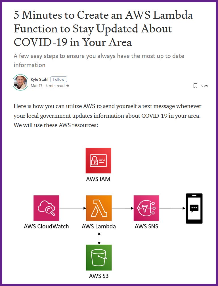 #AWS Lambda Function to Stay Updated About COVID-19 in Your Area: https://towardsdatascience.com/5-minutes-to-create-an-aws-lambda-function-to-stay-updated-about-covid-19-in-your-area-88a4abe77a04 …pic.twitter.com/wg5ka05MGK