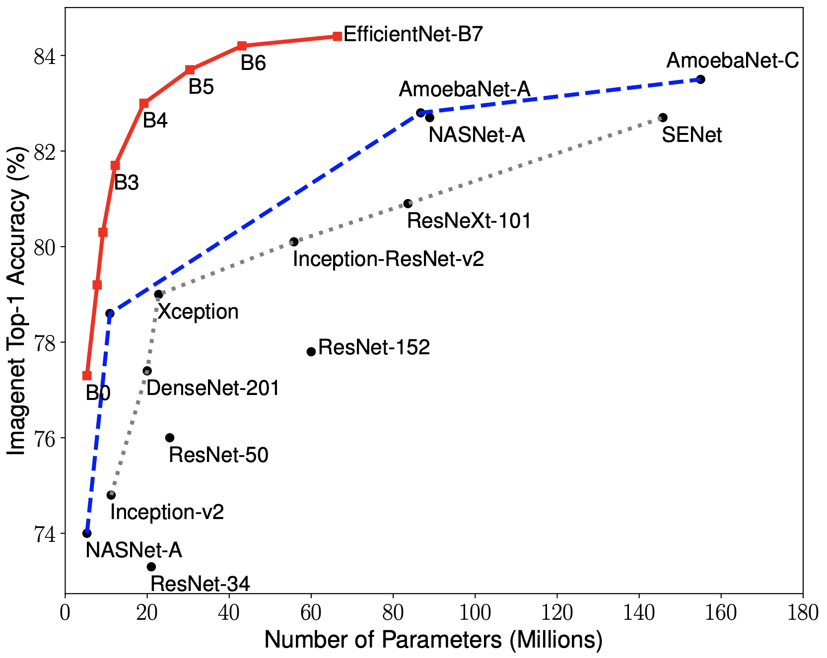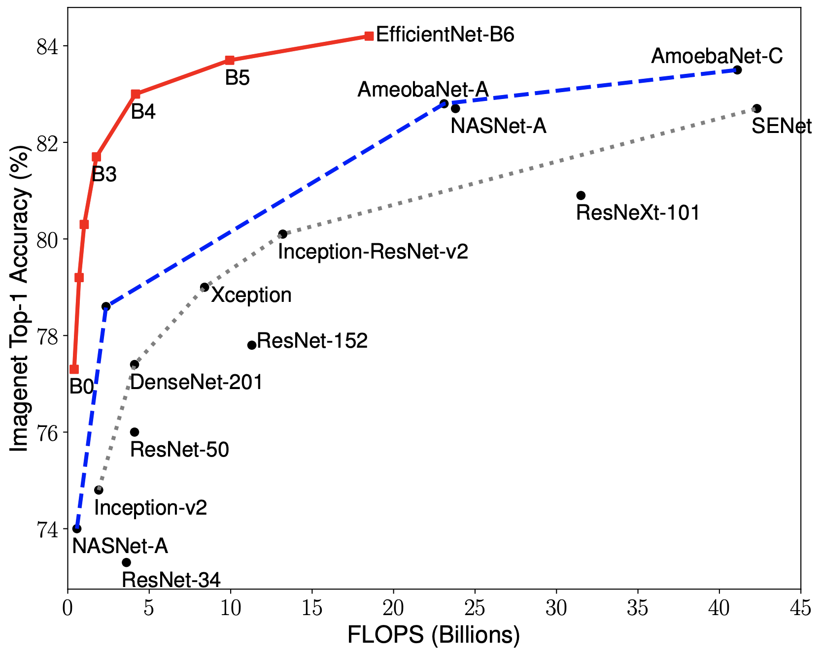 Compared to the widely used ResNet-50, EfficientNet-B4 improves the top-1 accuracy from 76.3% of ResNet-50 to 82.6% (+6.3%), under similar FLOPS constraints.