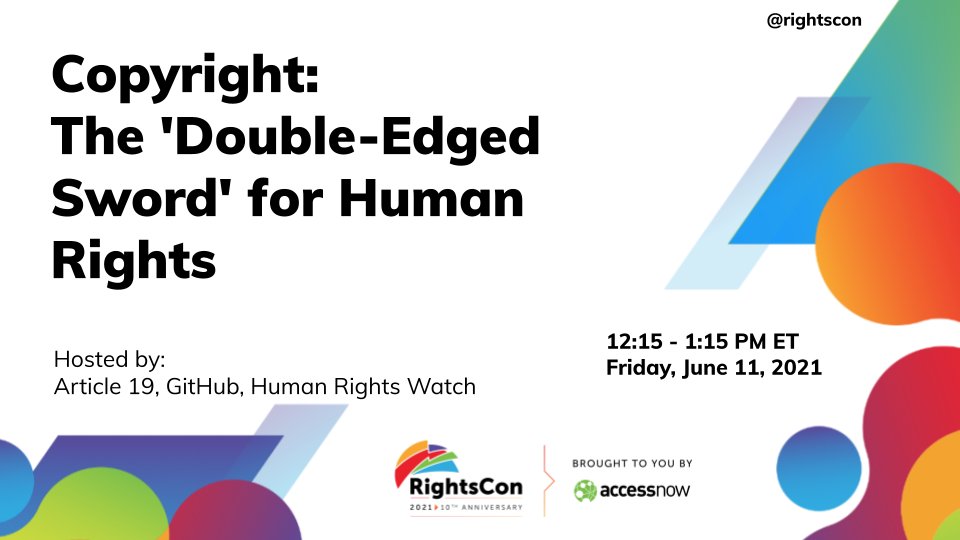 #RightsCon this week? On Friday, we'll dive into the benefits and challenges of copyright law for human rights in a session cohosted by@article19org &@hrw. Join our own@vollmerabby, along with@ng_yvonne,@vladyruzo,@ViviRangel88 & Gabi Ivenspic.twitter.com/dLD3gKt35g