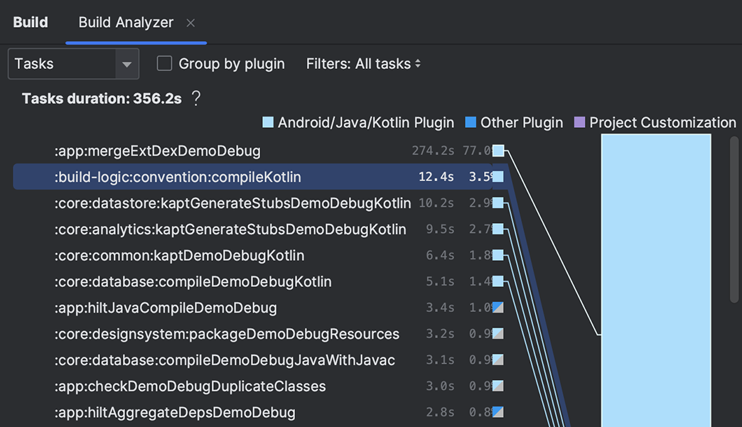 Powered by Gradle, Android Studio's build system lets you to customize your build to generate multiple build variants for different Android devices from a single project. Then analyze the performance of your builds and understand where potential build issues exist in your project with the Build Analyzer.